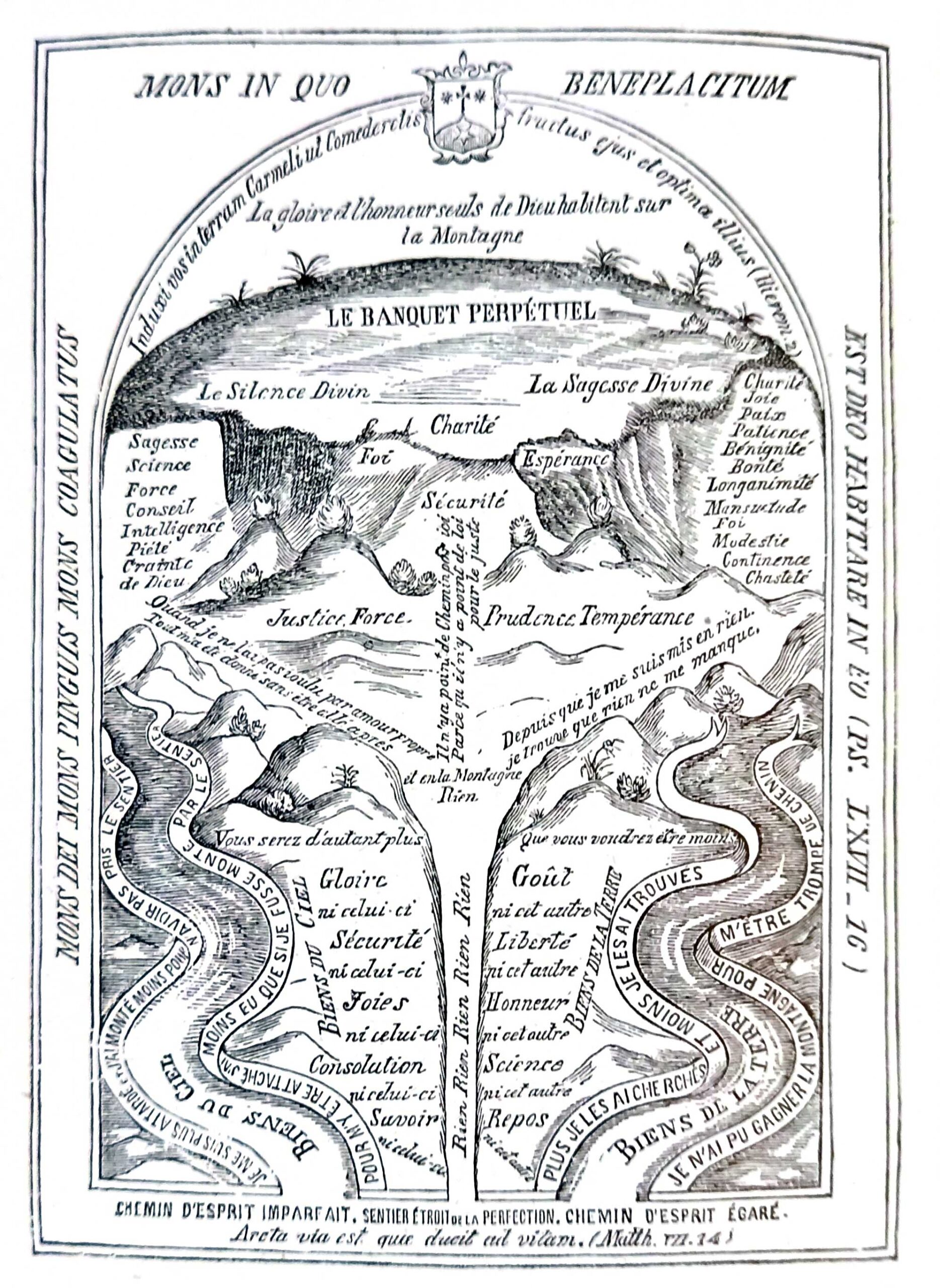 L’état d’esprit que Jésus dénonce ici, mais qu’Il veut en même temps guérir, c’est ce que Jean de la Croix nomme l’orgueil spirituel. Il en parle longuement au début de son traité de la Nuit obscure. Posant son regard d’accompagnateur spirituel sur ceux qui s’aveuglent eux-mêmes dans le pharisianisme, Jean les dénonce ainsi : « Vous les verrez très satisfaits d’eux-mêmes et de leurs œuvres. Ils blâment les autres, comme le pharisien qui méprise le publicain. » (NO 1,2,1). Pour nous guérir de cette attitude, Jean a synthétisé sa doctrine dans son célèbre schéma du Mont-Carmel. Arrêtons-nous sur ce dessin très éclairant. Nous y voyons l’ovale d’une montagne dont trois chemins proposent l’accès vers le sommet. Ce sommet symbolique, c’est la perfection de l’union au Dieu d’Amour miséricordieux. Ce sommet touche donc le « Ciel ».